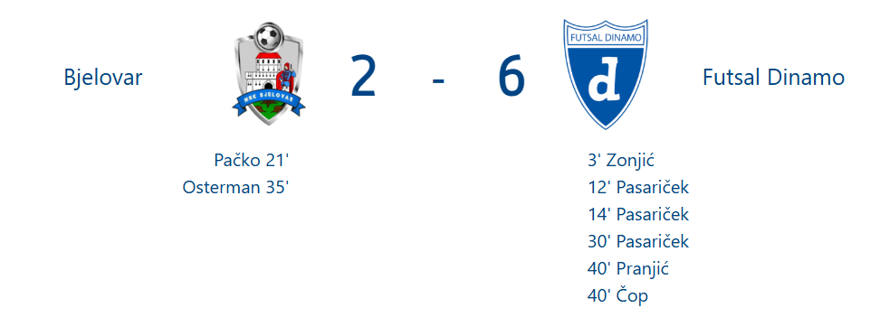 Igrači Futsal Dinama od početka utakmice tražili su pogodak. Nakon nekoliko pokušaja dolaze do vodstva pogotkom Zonjića na asistenciju Filipa Novaka. Plavi su nastavili vršiti pritisak tražeći drugi pogodak, no domaći vratar bio je spreman na sve izazove. Veliku priliku imala je domaća momčad, no nakon fantastičnog udarca lopta pogađa prečku. U sljedećem napadu Dinamo povećava vodstvo pogotkom Pasaričeka. Plavi su nastavili prijetiti i s takvom igrom dolazi do novog pogotka, strijelac je Pasariček. Pokušali su domaćini igru s golmanom igračem, no u silnim napadima pogodili su dvije vratnice. Rezultat se nije mijenjano i Dinamo na poluvrijeme odlazi s uvjerljivih 3:0.