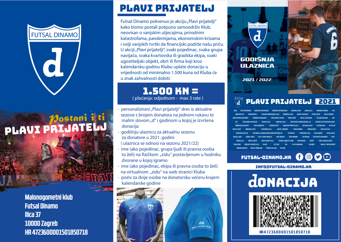 Iznos za Plavog prijatelja 2021 možete uplatiti na račun MNK Futsal Dinama HR4723600001501850718 ili skeniranjem barcodea: